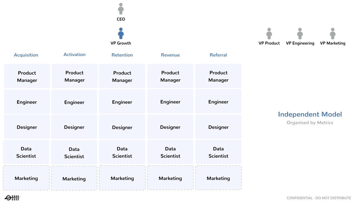 Finally, when you use the independent model and your cross-functional team members work fully on the biggest growth levers, we like to ideally create a clear split between cross-functional teams and functional teams.